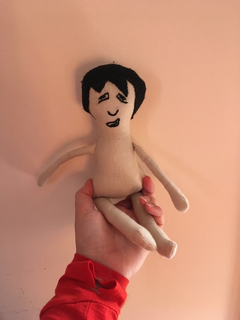 I’m also happy with this human doll pattern and its hair, but the face is obviously a total disaster. There are so many problems with the embroidery I’m not even sure where to start. So it’s a pretty strange doll. It looks flustered.