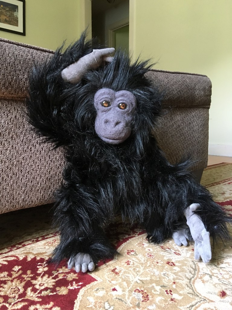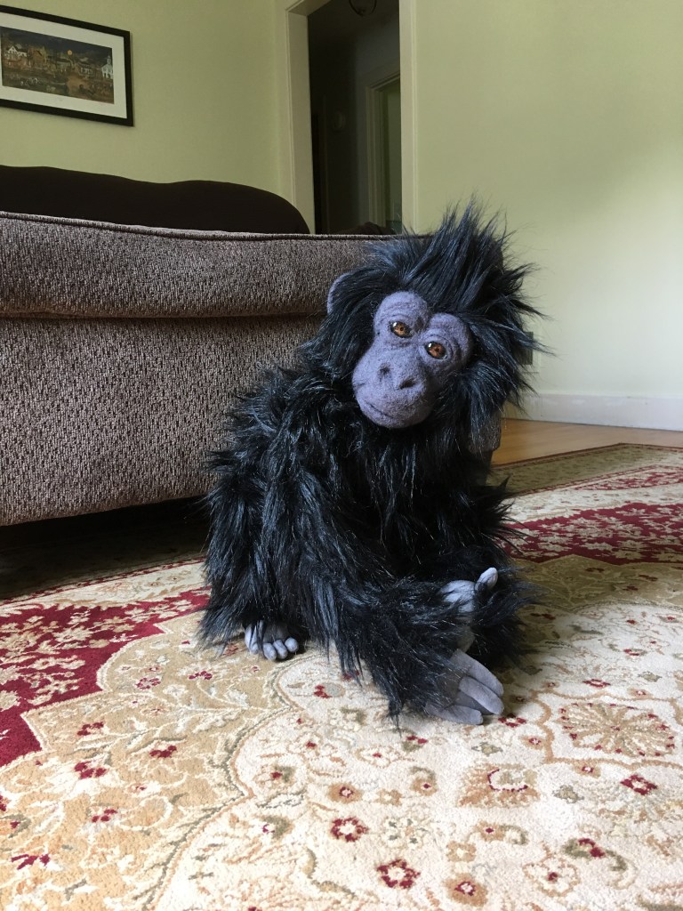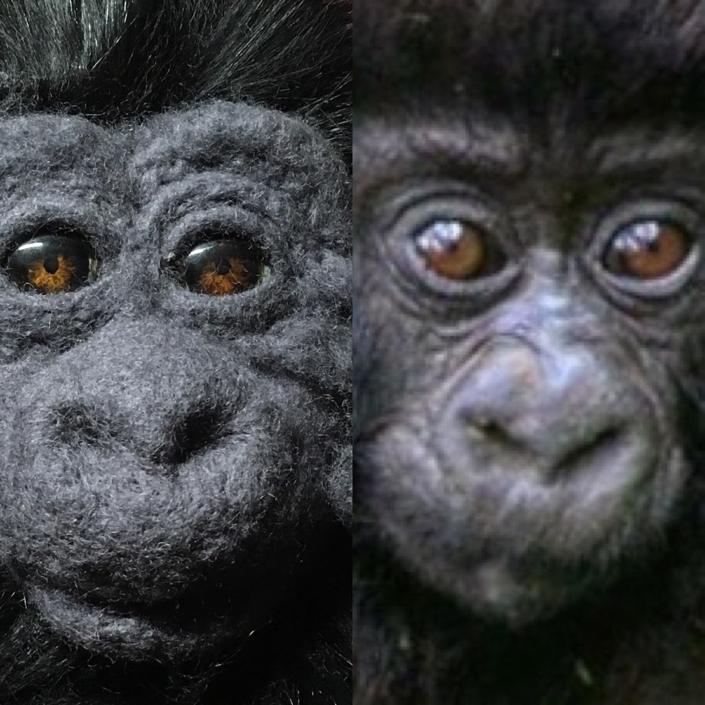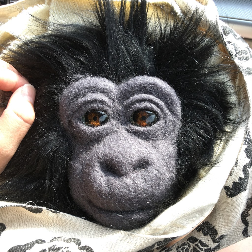 I’ve been working on this sweet baby mountain gorilla. He’s made in the same basic style as my other needle felted and plush apes, but with fabric hands and feet. I also put a new kind of armature in him that I’ve not used before. It makes him totally pose-able which is ever so fun! He’s not quite finished, but I couldn’t wait to share.